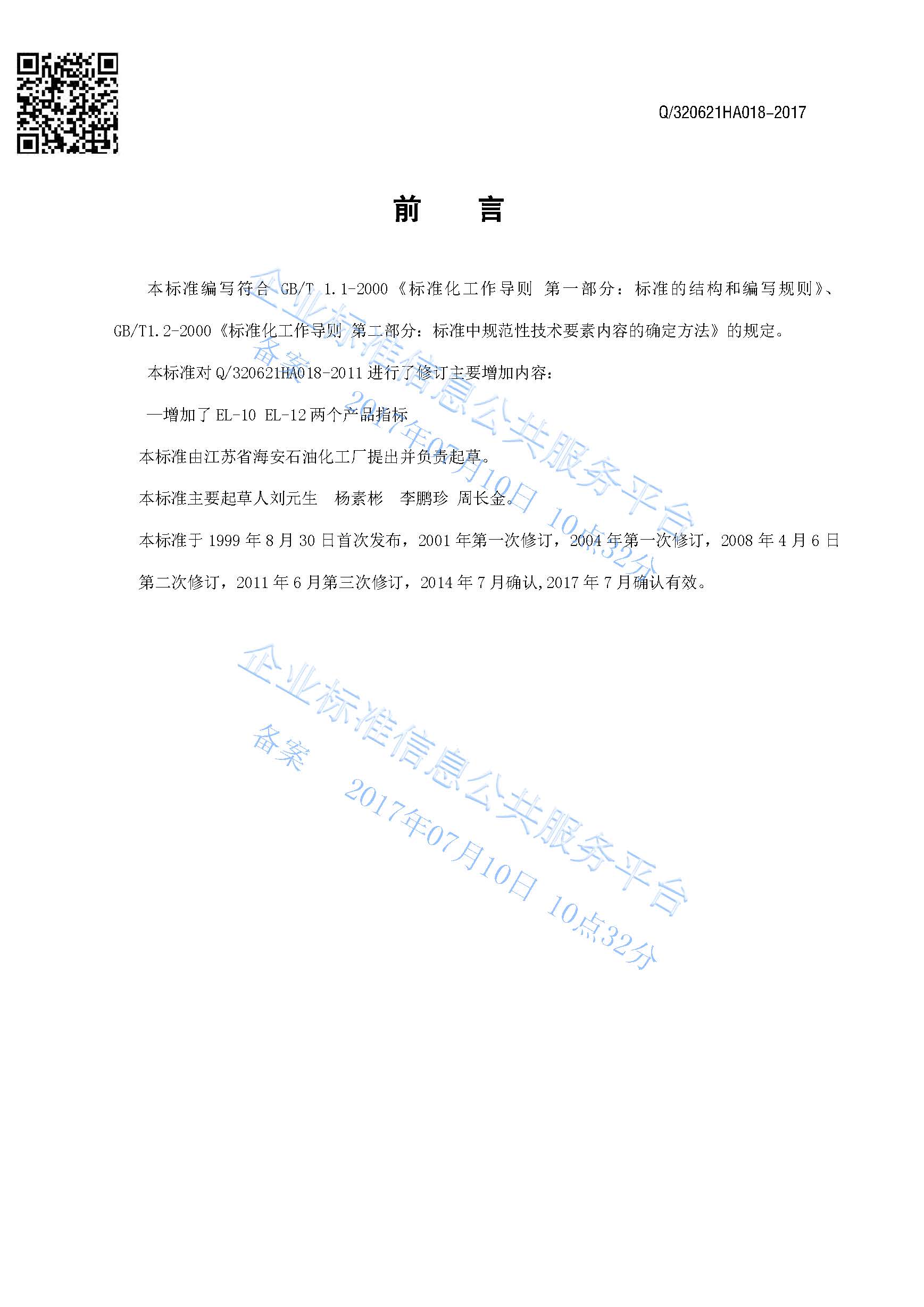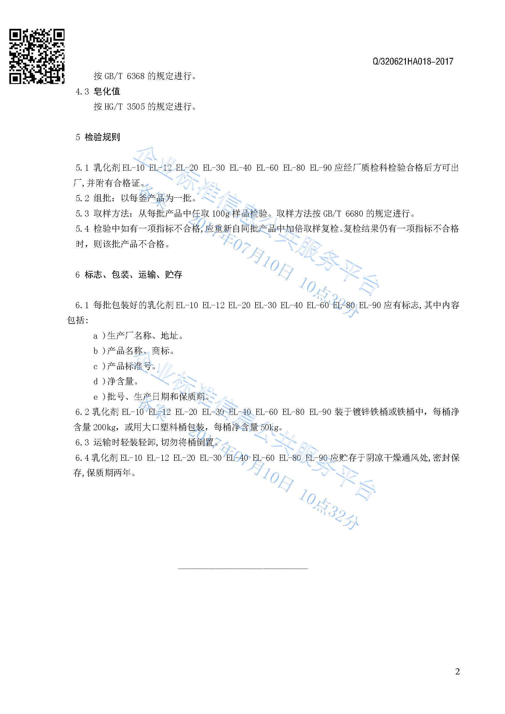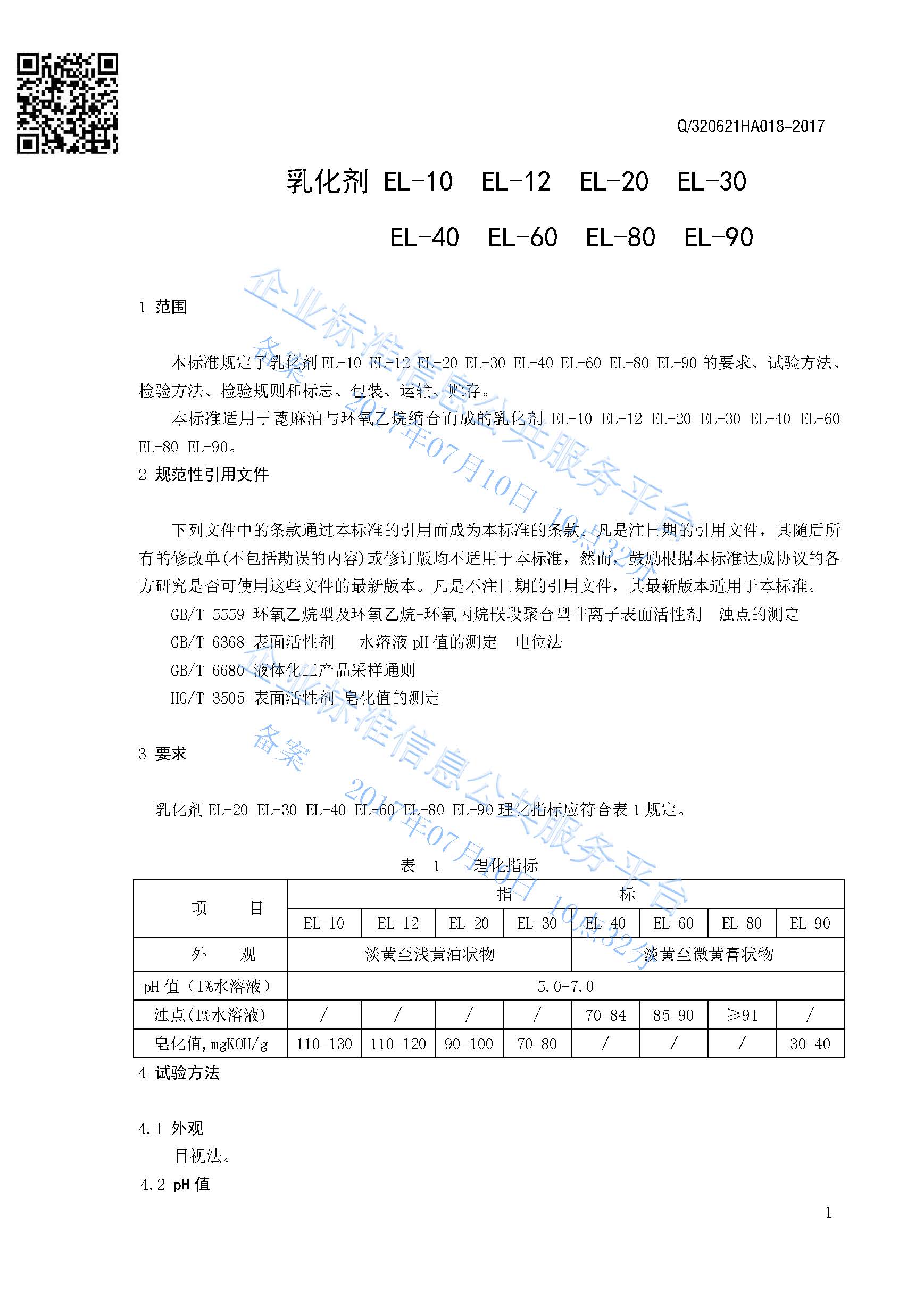 Q/320621HA018-2017 乳化剂EL-10 EL-12 EL-20 EL-30 EL-40 EL-60 EL-80 EL-9产品标准