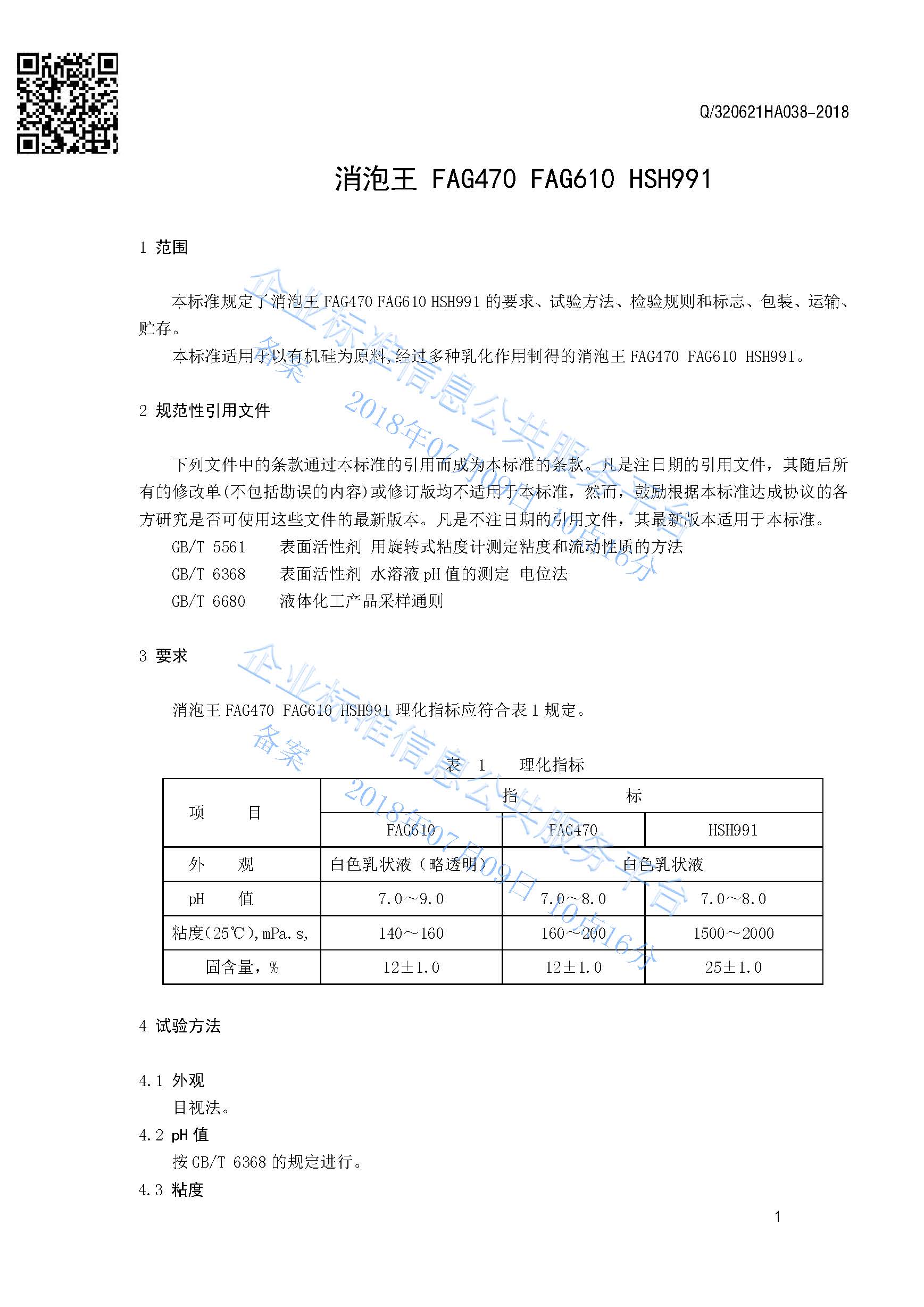 Q/320621HA038-2018 消泡王FAG470 FAG610 HSH991产品标准