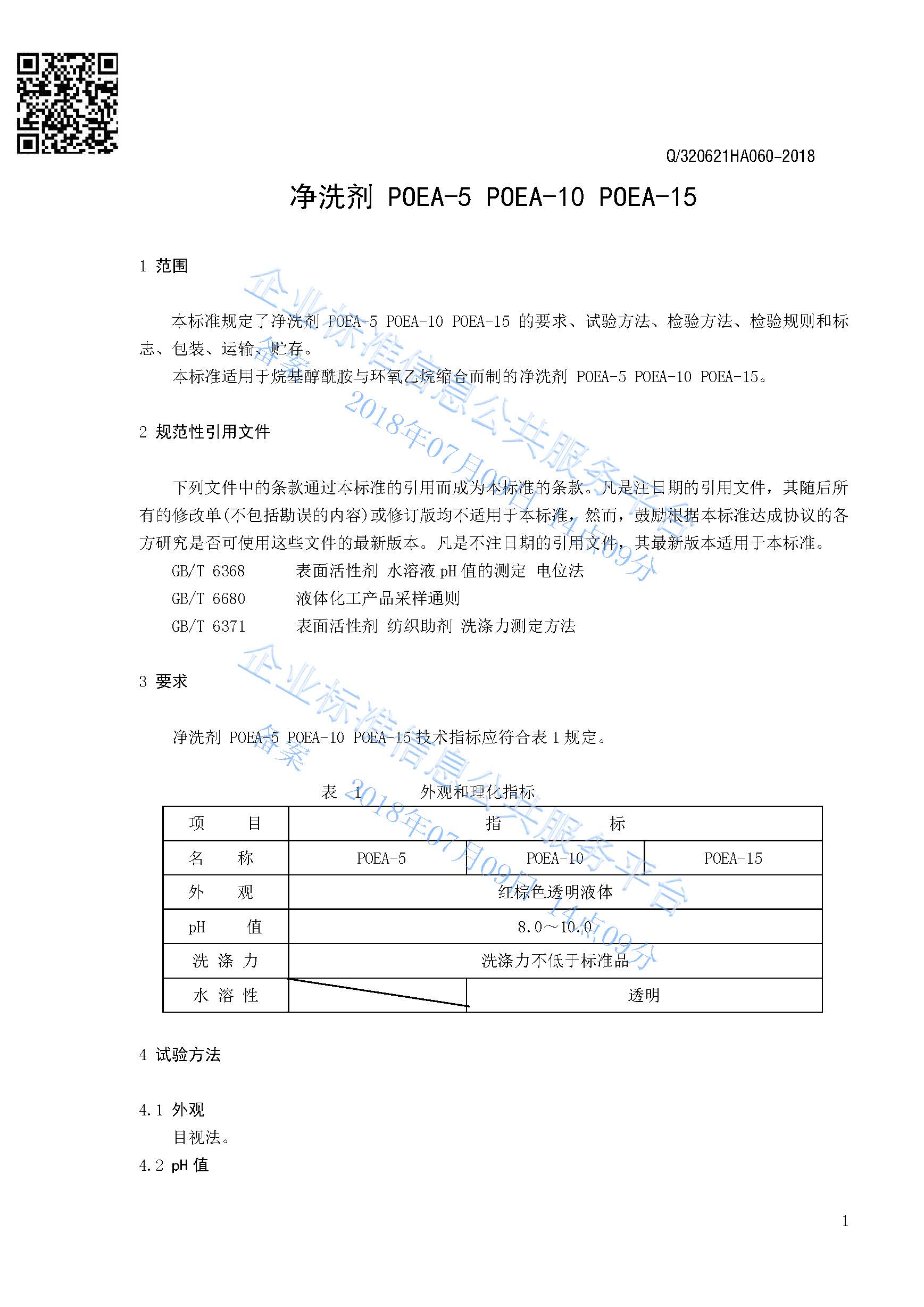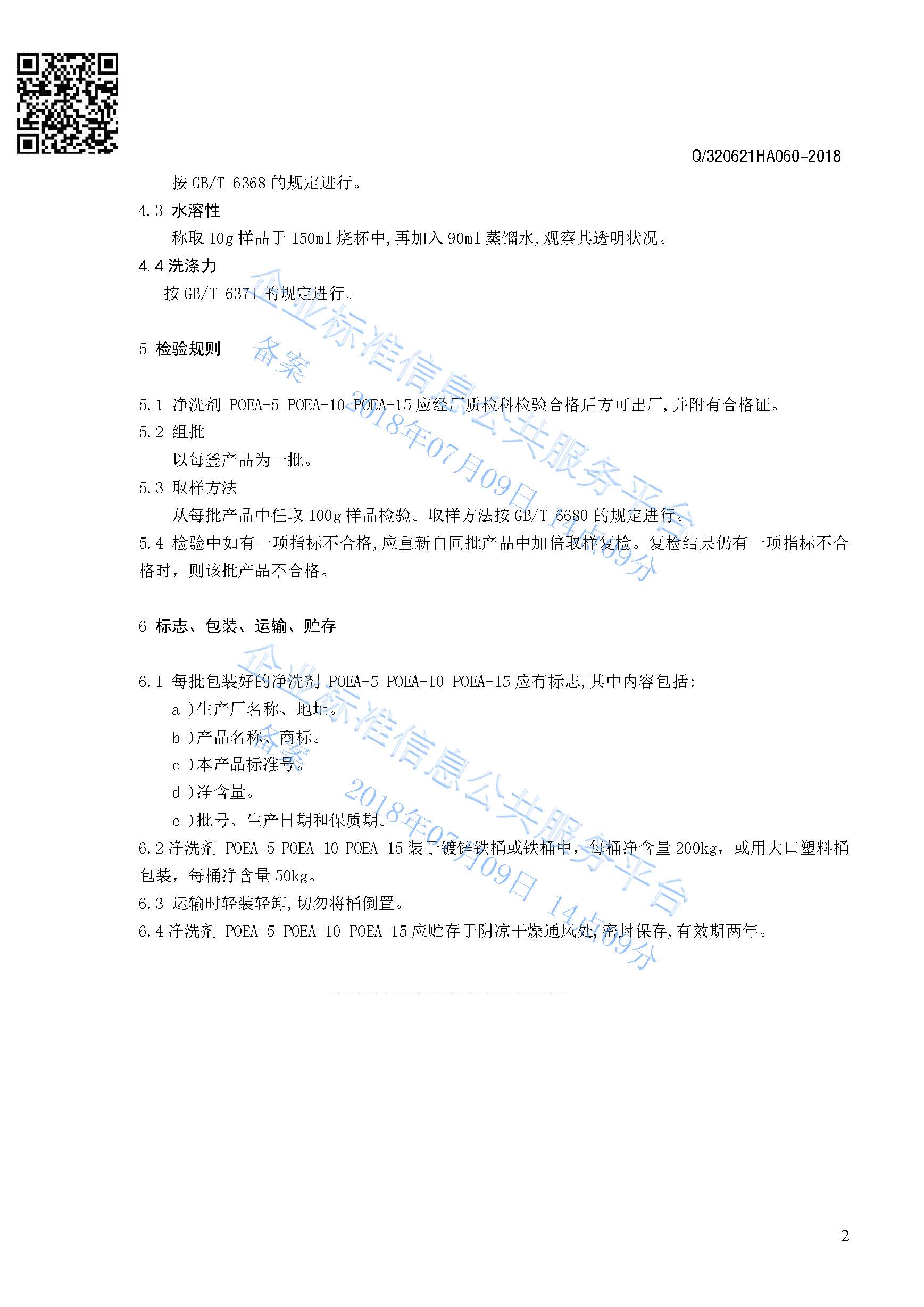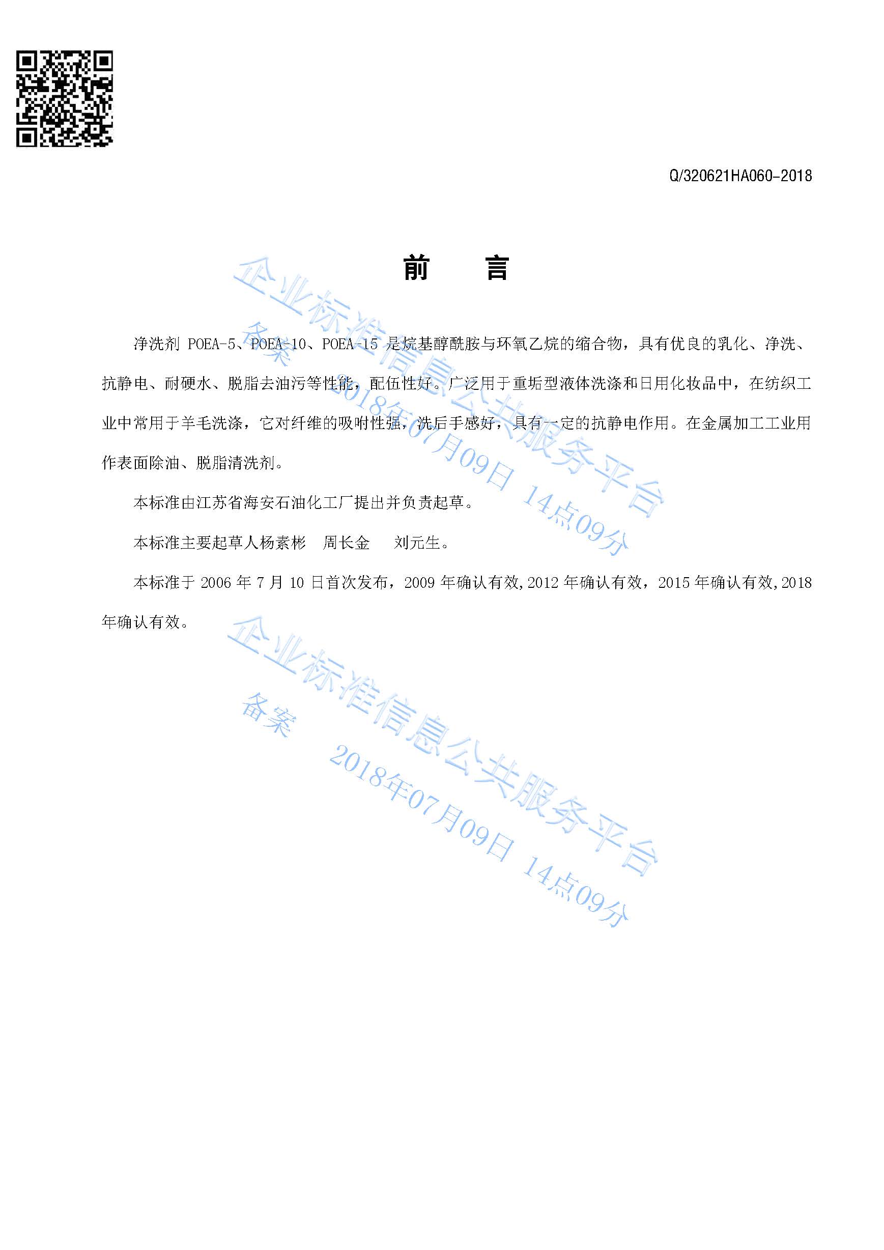 Q/320621HA060-2018 净洗剂POEA-5 POEA-10 POEA-15产品标准