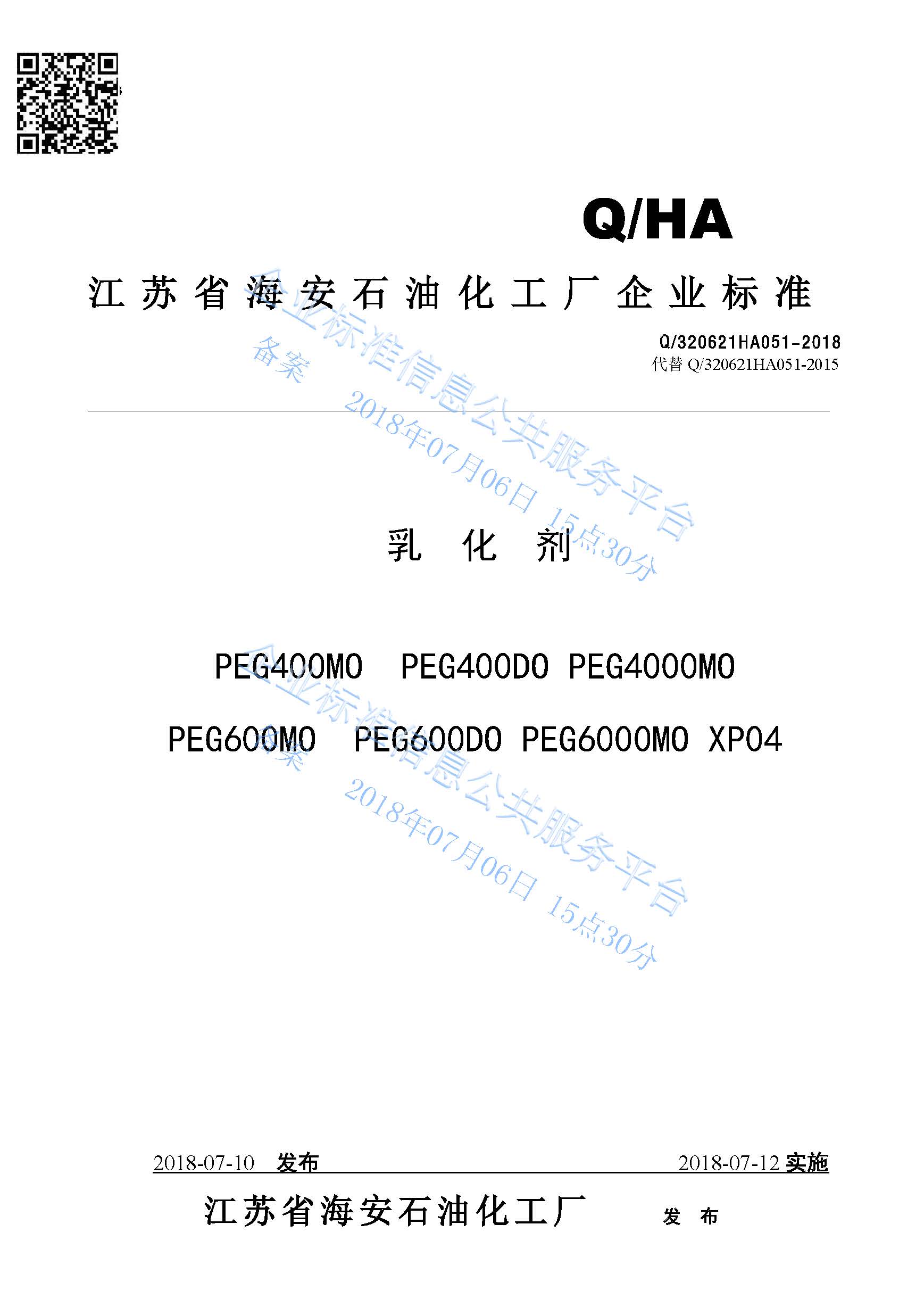 Q/320621HA051-2018 乳化剂PEG400MO