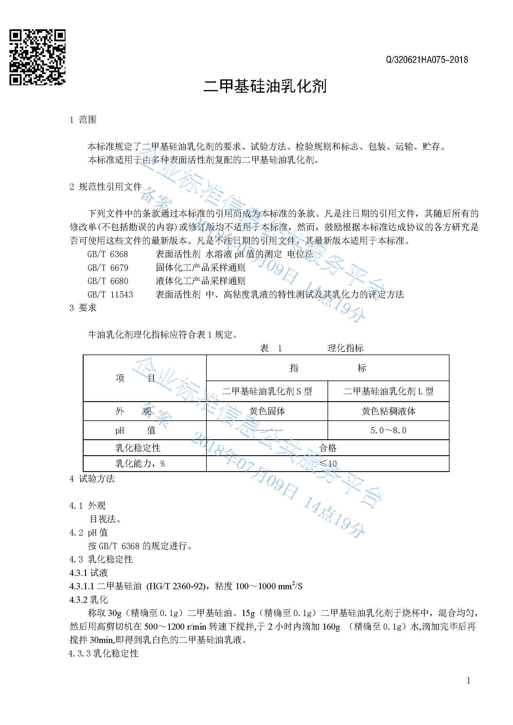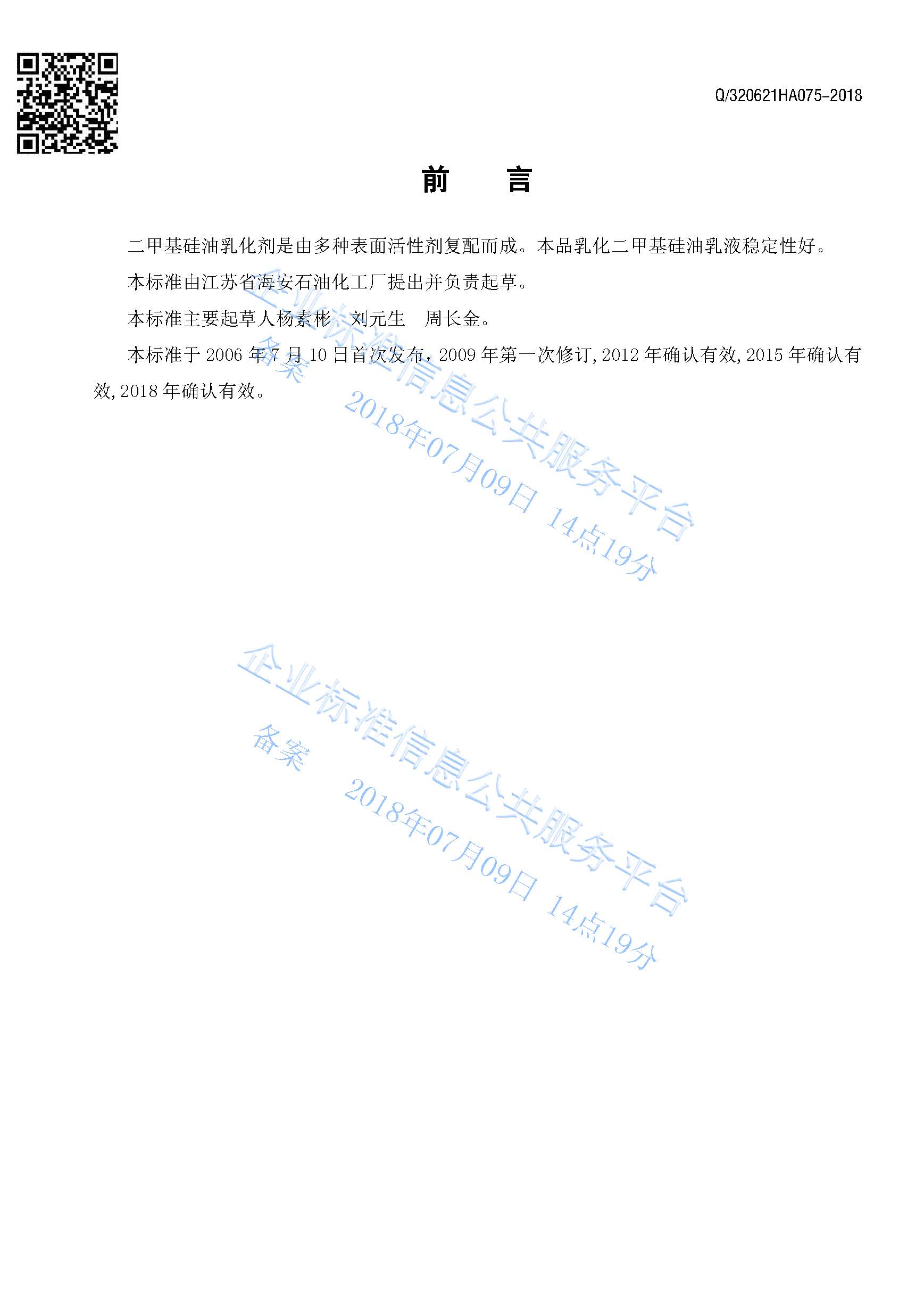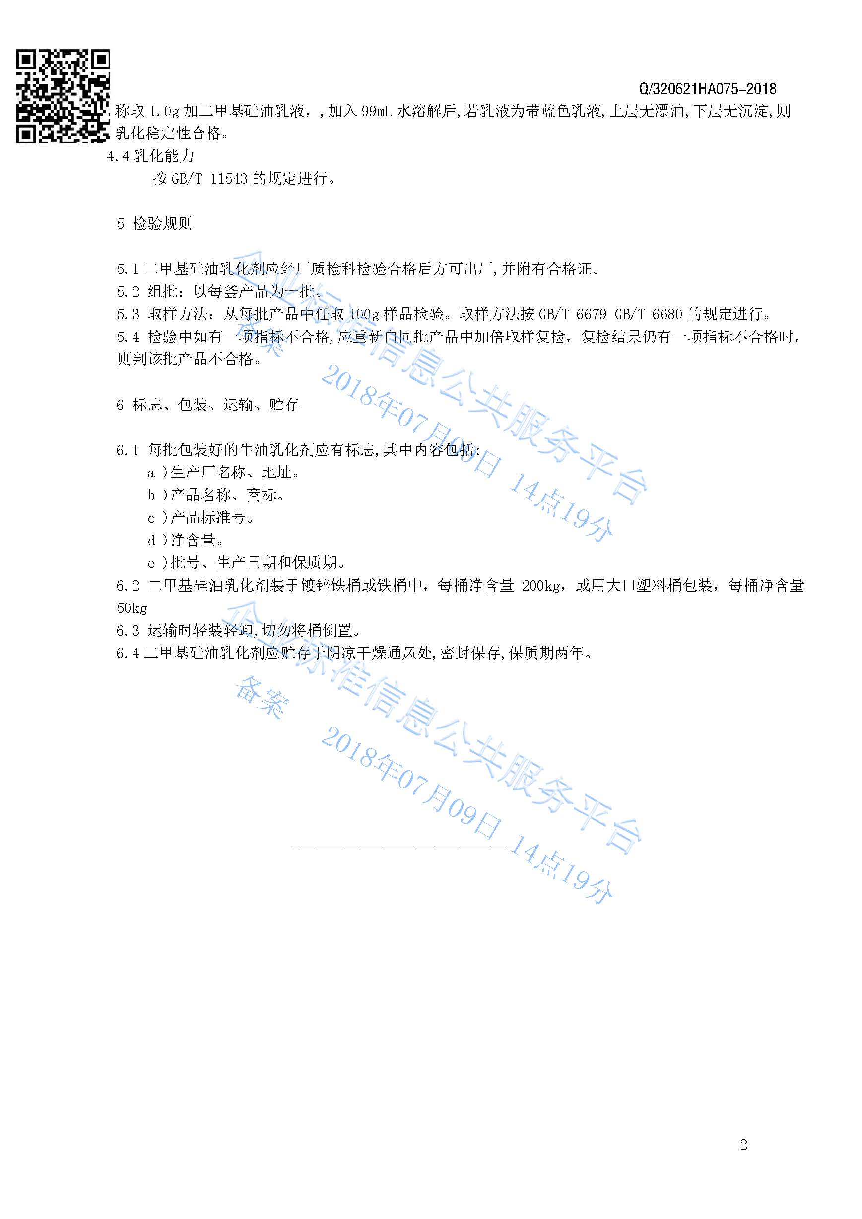 Q/320621HA075-2018 二甲基硅油乳化剂产品标准