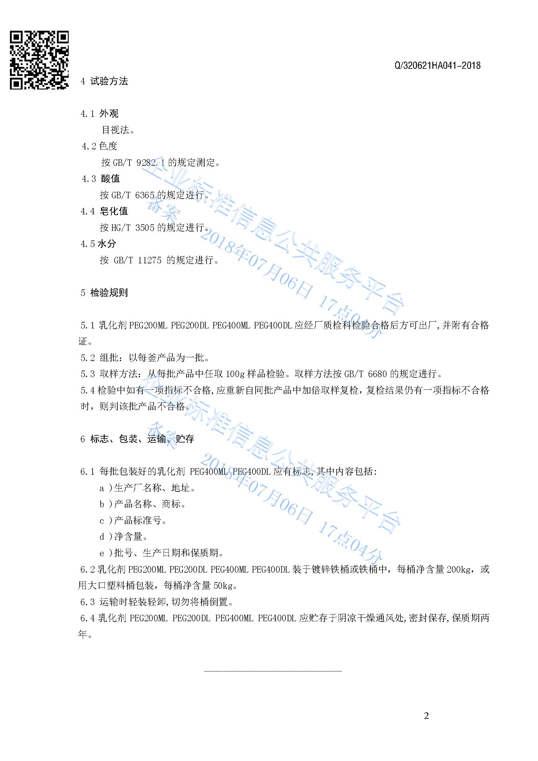 Q/320621HA041-2018 乳化剂PEG200ML PEG200DL PEG400ML PEG400DL产品标准