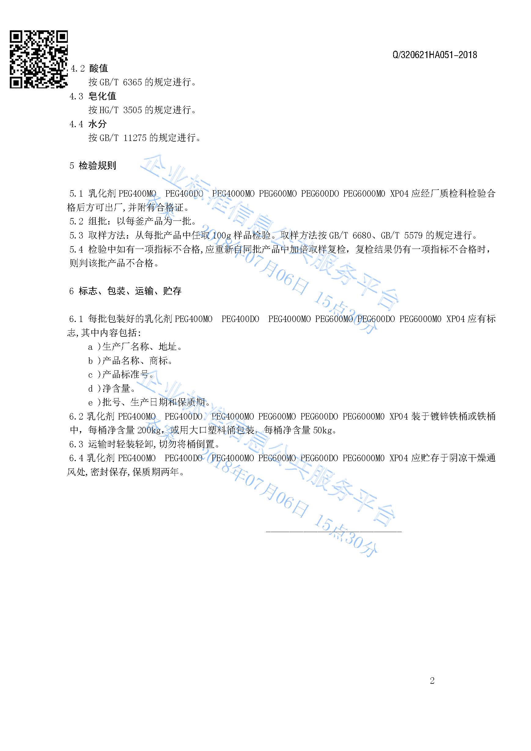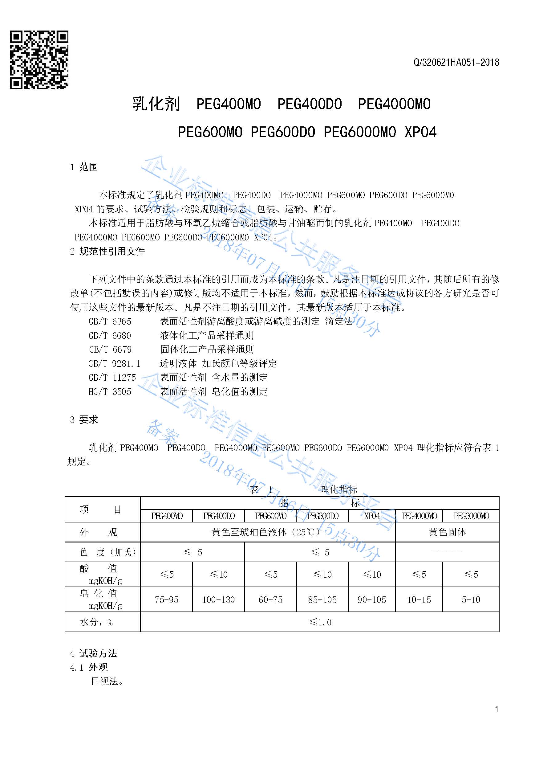 Q/320621HA051-2018 乳化剂PEG400MO PEG400DO PEG4000MO PEG600MO PEG600DO PEG6000MO XP04产品标准