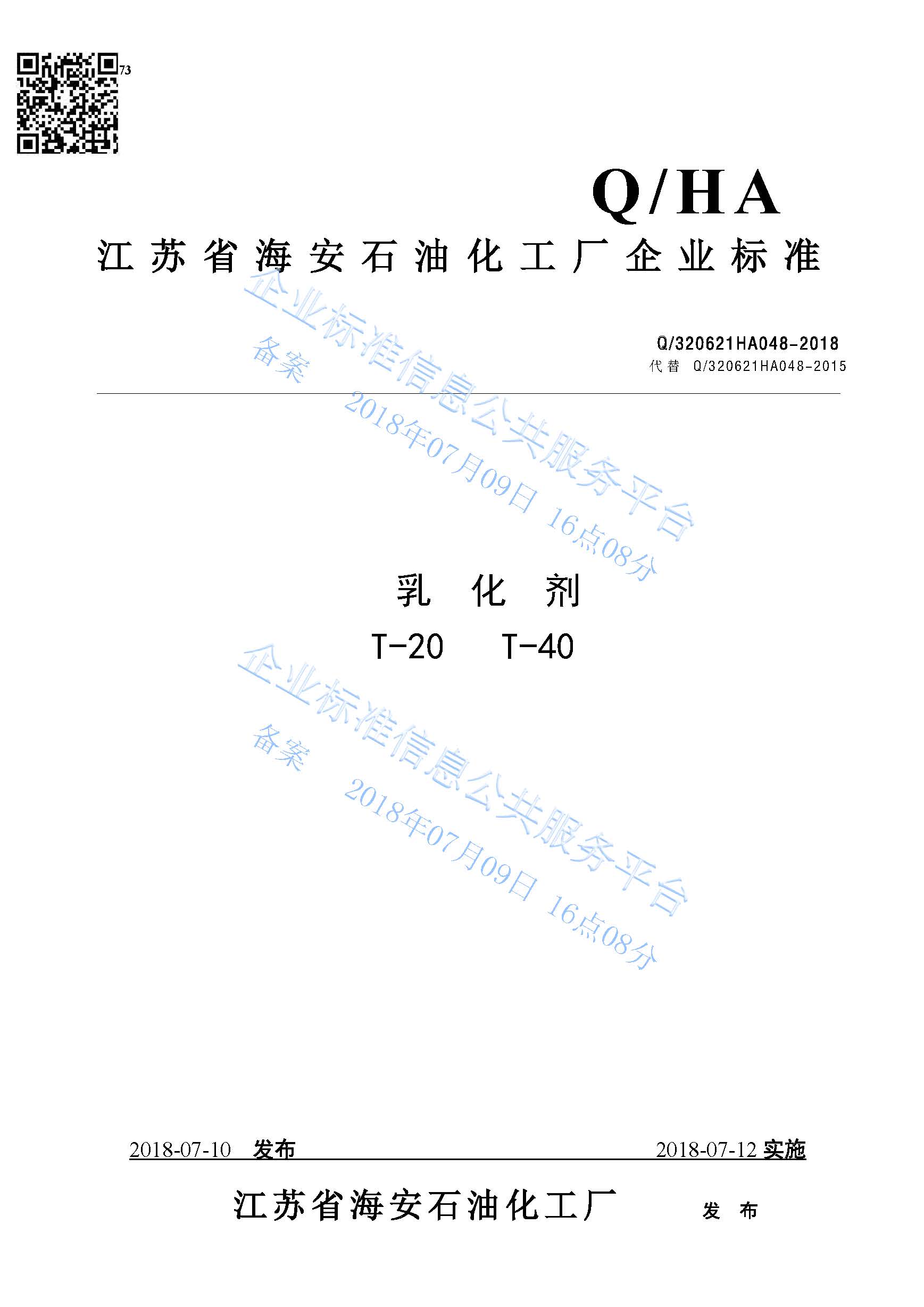 Q/320621HA048-2018 乳化剂T-20 T-4